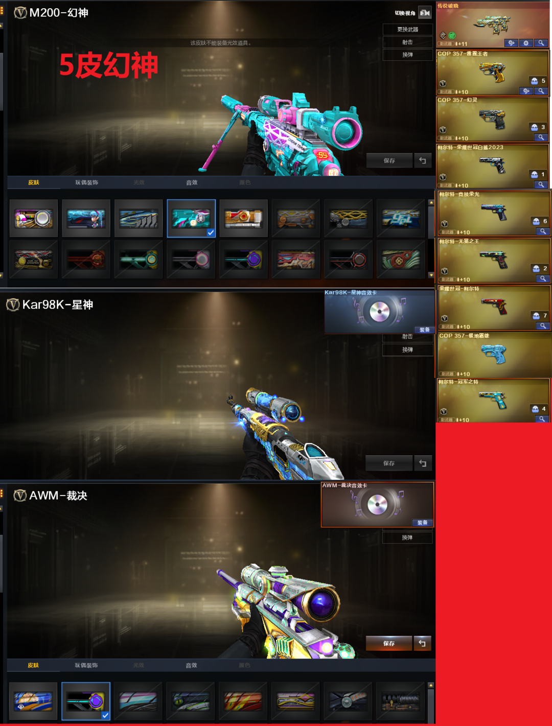 装备描述:排位:可以、、、、、、、、、、爆破四防:幻神5皮(传奇欧欧、24AG冠军、白鲨、电流骇客、动感闪耀皮肤)、M200-竞技荣光、王者风神、王者星神、98K星神、、、、、、传说破晓、柯尔特竞技荣光、23白鲨柯尔特、柯尔特-无冕之王、世冠柯尔特、COP雷霆王者、冠军之特、COP极地霜雄、、、、、、G36幻影、传说辉光、FAMAS G2-天戎、白虎、QBZ金色蔷薇、、、裁决音效、幻影音效、星神音效、蔷薇音效、白虎音效、雷神音效、极光音效、、、1套雷暴、1套夜魔、2套幻灵、1套竞技荣光、3套神工天巧、1套云龙、1套雷霆王者、、、、爆破四防(王者影豹、关小雨、机械姬)