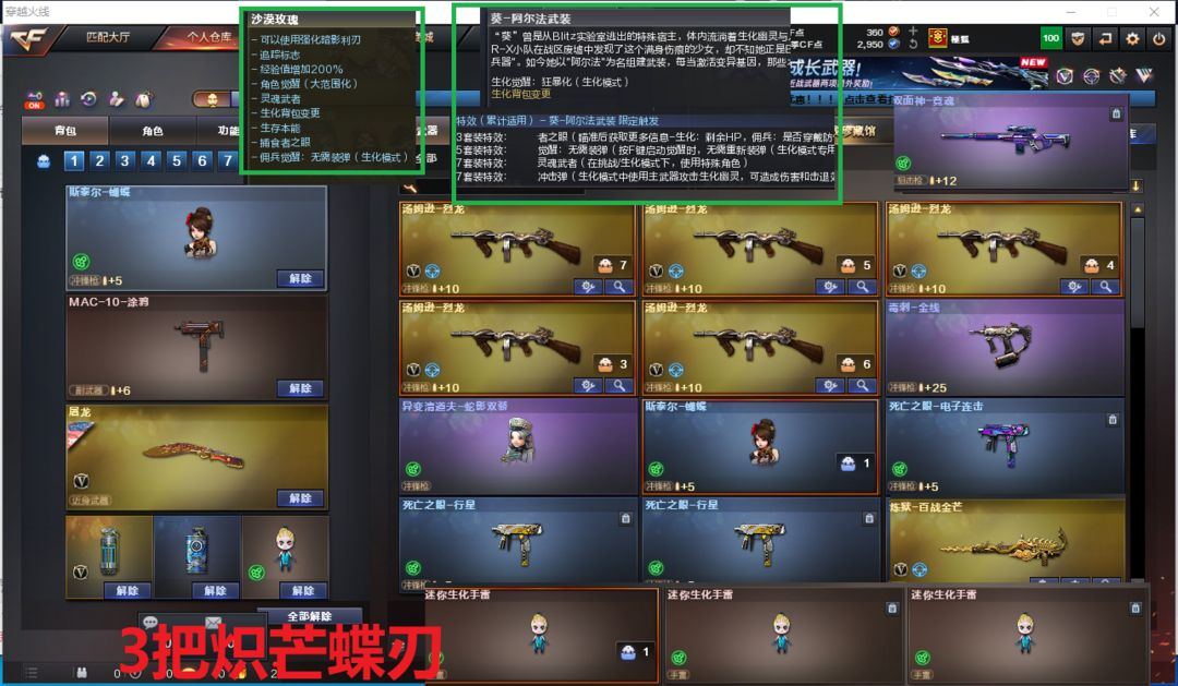 装备描述:排位:可以-----------生化四防全装(可以变更背包、看僵尸血量):5烈龙、斯泰尔蝴蝶、异变清道夫-小人枪、死亡之眼、MAC-涂鸦、手斧镜、3个生化减速雷、超级对讲机、、、、、、、、、爆破四防:幻神2皮(周瑜、丹凤皮肤)、USP雷暴王者、、、、柯尔特EP荣耀、加利尔ACE-天袭、九霄圣角、FAMAS G2-天戎、白虎之魄、、、裁决音效、天罚音效、、、7套电竞装甲、、、生化四防(沙漠玫瑰、葵-阿尔法武装)、爆破四防(妮妮)