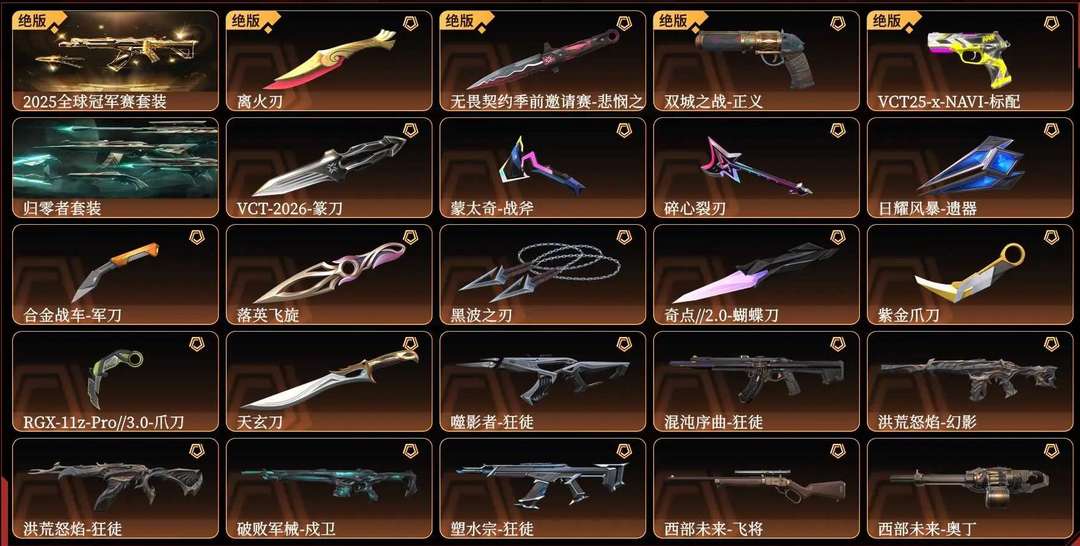 可排位✅10W库存⭐VCT26篆刀离火刃怜悯黑波显卡爪落英⭐25冠军套盖亚/混沌/流脓/赤焰侦查幻影