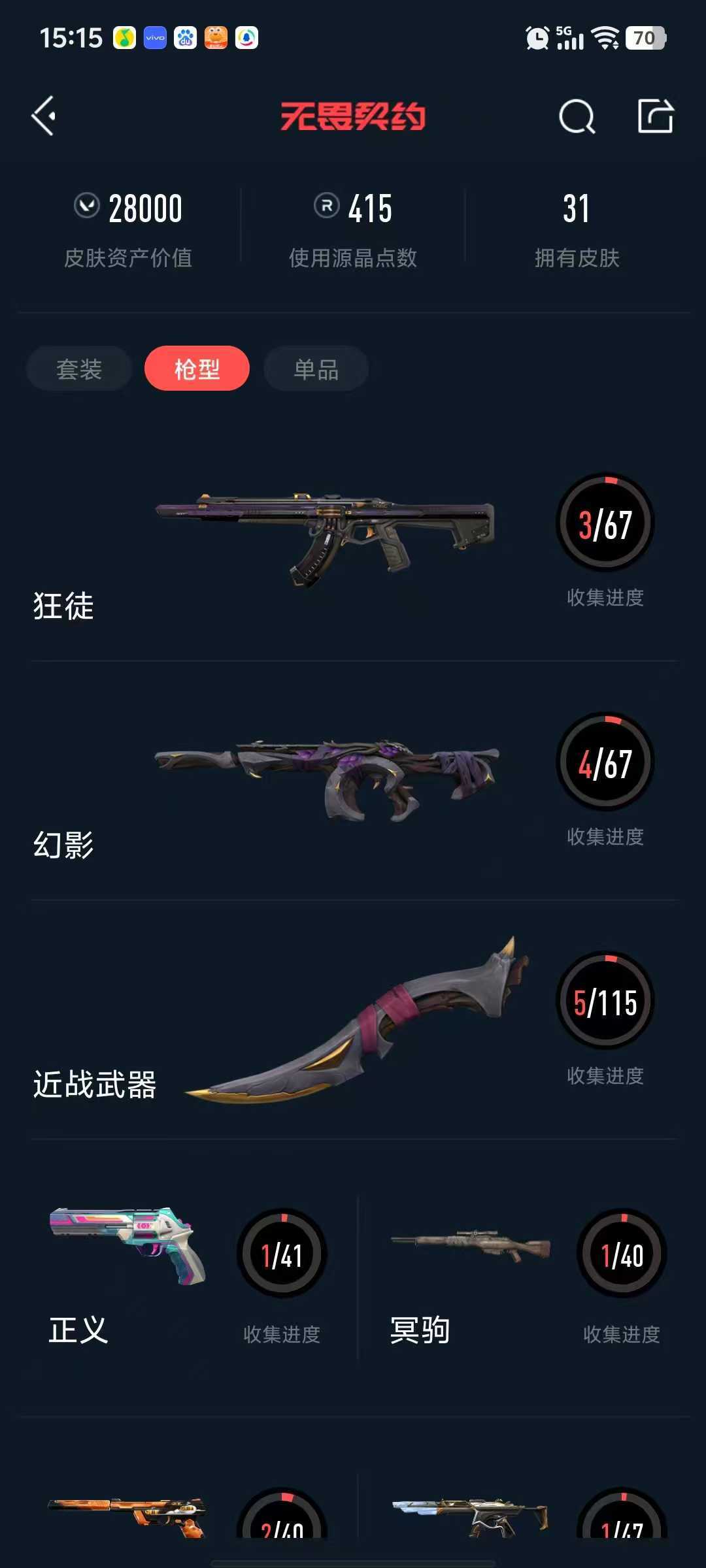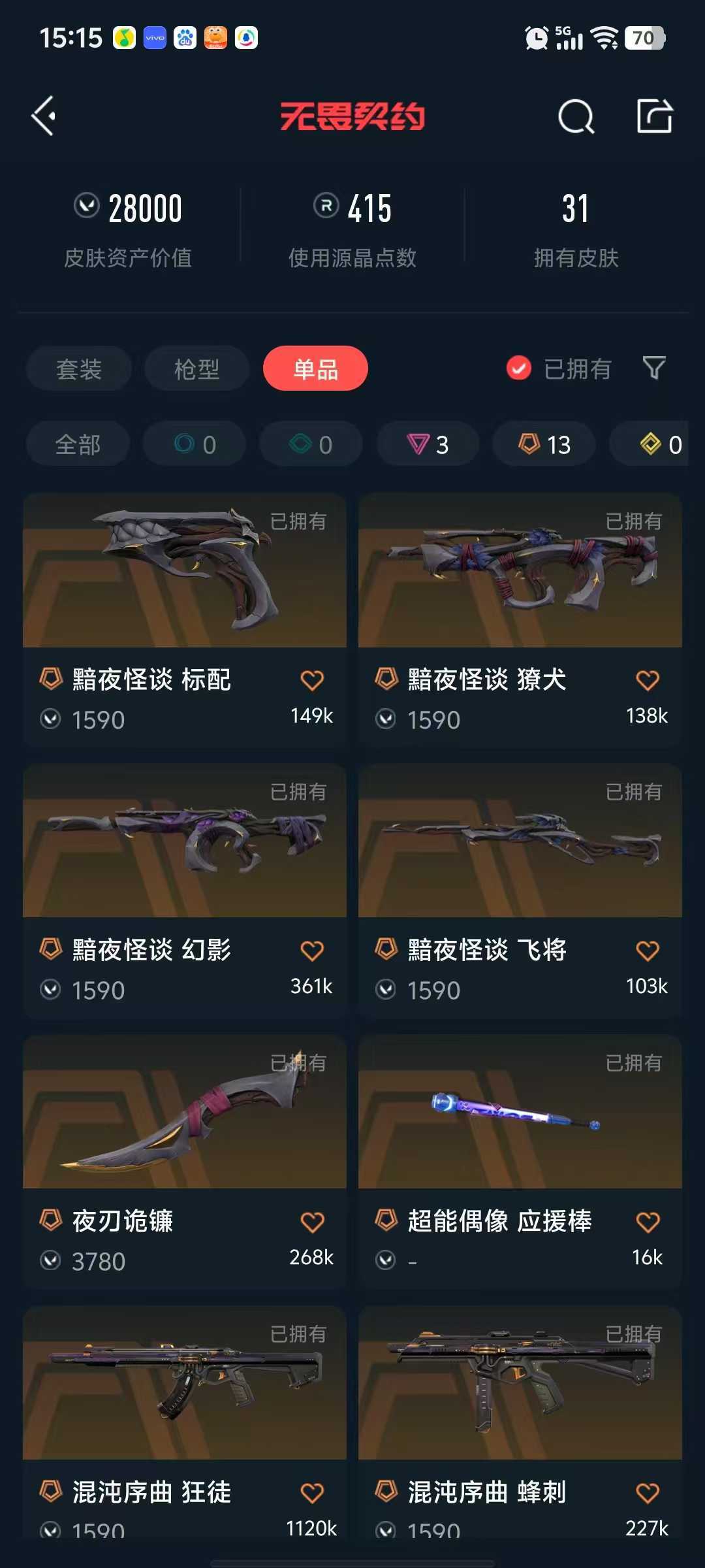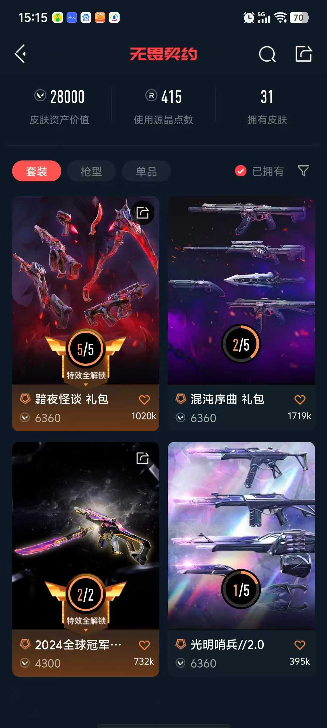 装备描述:刀皮数量5,枪皮数量26(限定13究极0尊爵3);已用无畏点数28000,已用源晶点数415;近战武器-2024全球冠军赛战刀,近战武器-闪耀之星荧光棒,近战武器-夜刃诡镰,近战武器-澄湖滟,近战武器-神罚军刀,标配-黯夜怪谈,骇灵-光明哨兵2.0,蜂刺-混沌序曲,狂徒-混沌序曲,幻影-2024全球冠军赛,幻影-黯夜怪谈,獠犬-黯夜怪谈,飞将-黯夜怪谈,狂徒-盖亚的复仇,幻影-侦察力量,奥丁-紫阙金琅2.0,正义-复古浪潮,鬼魅-光导纤维,冥驹-沙场老兵,标配-超能偶像,判官-超能偶像,戍卫-超能偶像,狂徒-超能偶像,狂怒-聚合之力,鬼魅-采蜜小蜂队,蜂刺-聚合之力,判官-采蜜小蜂队,獠犬-采蜜小蜂队,幻影-聚合之力,飞将-聚合之力,战神-采蜜小蜂队