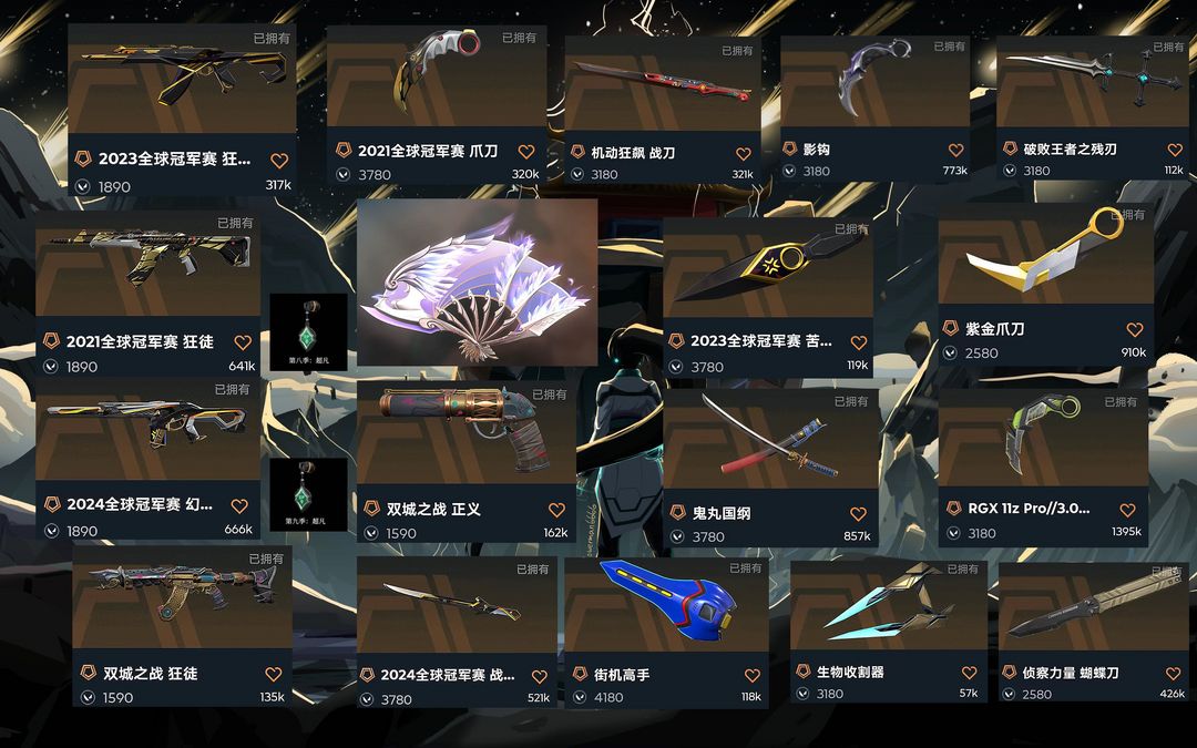 装备描述:21冠军套 24冠军套 23冠军套 离火刃 金克丝爆爆ak 爆爆左轮正义 归零者一套 电玩一套 掠夺一套 太刀 显卡爪 掠夺爪 爱沃莉 超时空 混沌 流脓洪荒 溯水宗 全息 奇点 砰砰特工队 海洋之星 侦查 盖亚 炒饭挂饰
