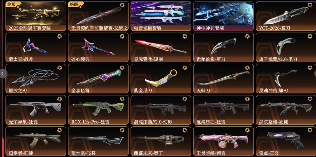 装备描述:VCT26篆刀✨悲悯之刃✨25冠军套✨光谱套✨紫金爪刀✨天御刀✨