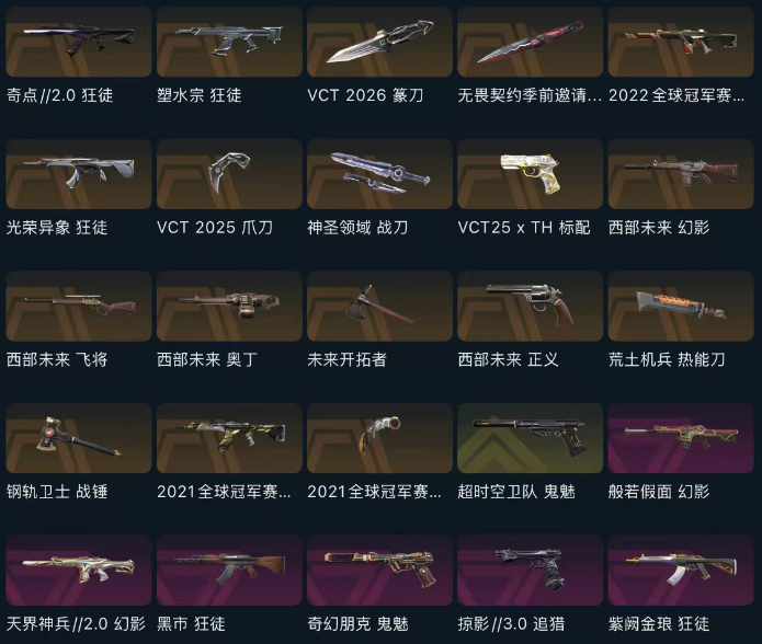 可排位|22/21冠军套|VCT26篆刀/VCT爪刀/怜悯之刃|塑水宗光荣AK|掠夺追猎|超时空鬼魅