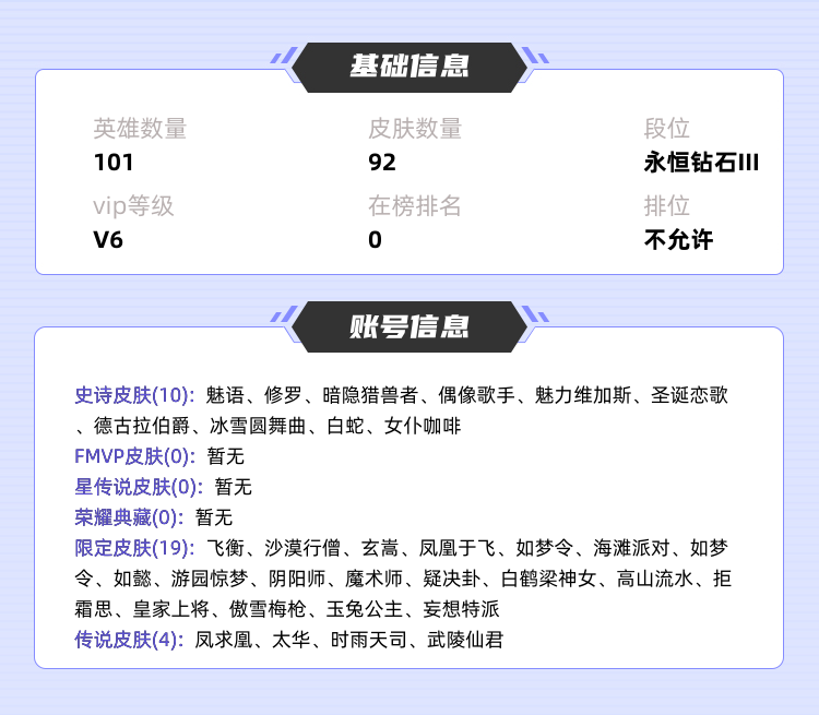 装备描述:>>>>>>毁号,涉及毁坏虚拟财产罪及计算机安全罪,请文明游戏素质游戏,让我们共建美好租号平台>>>>>> 本游戏账号: ,英雄虽然少,应该有你喜欢的英雄。,皮肤多。 私人所属英雄皮肤有:伽罗 太华||李白 凤求凰||诸葛亮 时雨天司||诸葛亮 武陵仙君项羽 海滩派对||赵云 皇家上将||甄姬 游园惊梦||公孙离 玉兔公主||李元芳 妄想特派||安琪拉 如懿||大乔 白鹤梁神女||庄周 玄嵩||庄周 高山流水||明世隐 疑决卦||韩信 飞衡||韩信 傲雪梅枪||嫦娥 如梦令||嫦娥 拒霜思||狄仁杰 魔术师||狄仁杰 阴阳师||王昭君 凤凰于飞||后羿 如梦令,等等 注意事项: A.游戏过程中请不要恶意挂机或者不文明发言;B.恶意挂机、顶号等行为将被拉黑无法再次下单;C.进入游戏后中途请勿退出登陆,否则无法再次上号;D.部分账号由于异地登录可能会出现密码错误提示,通常再尝试5-6次后可上号。 |||||||||>喜欢本账号请点 ☆收藏☆ 方便下次租用,谢谢光临惠顾|||||||||